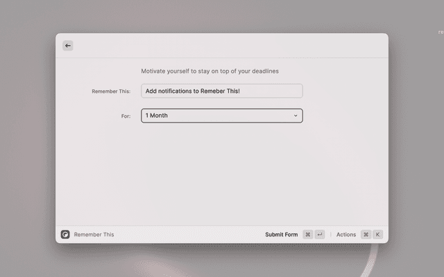 • To use Remember This, simply open Raycast and type Remember This in the Raycast bar. This will open the Remember This interface, where you can enter any information you want to remember, along with a due date. After the due date passes, the information will be automatically deleted from the app, creating a sense of urgency to complete the task before it's lost forever.