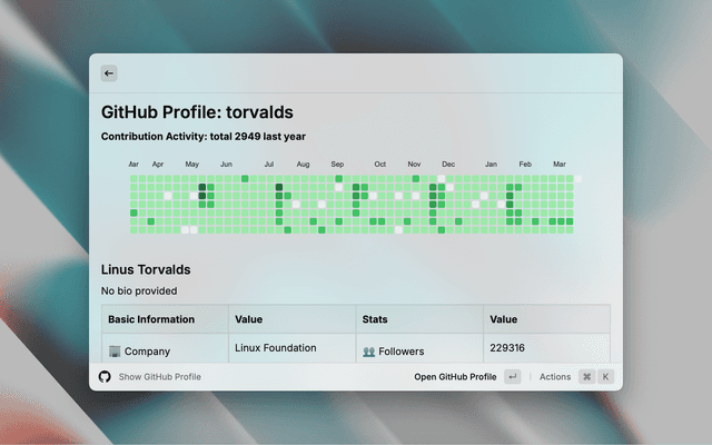 View GitHub user profiles directly from Raycast. ๐ฆ