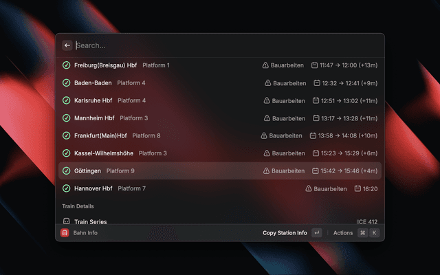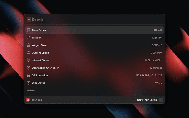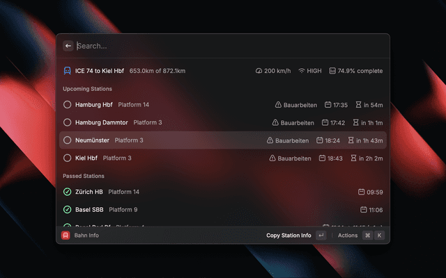 Real-time Deutsche Bahn ICE train information for Raycast.