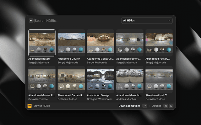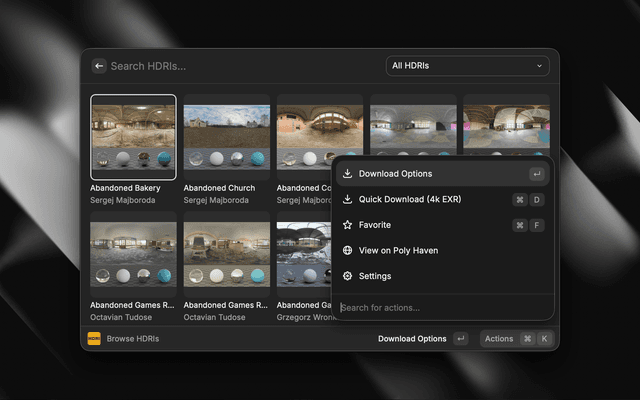 • Browse HDRIs: Search and browse the complete Poly Haven HDRI library with beautiful thumbnail previews