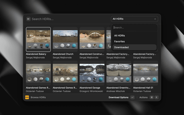 • Favorites: Save your favorite HDRIs for quick access