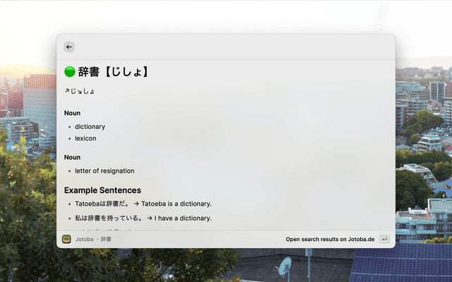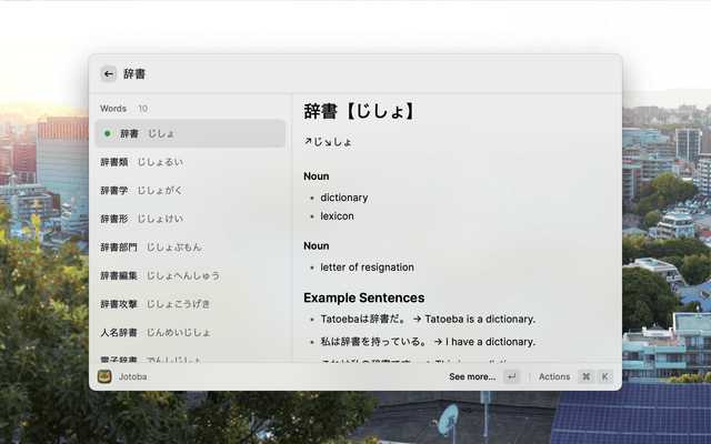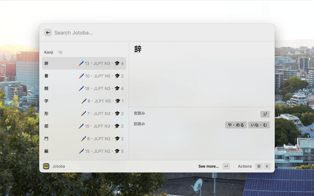 Raycast Jotoba is a Raycast extension designed to take advantage of the Jotoba project's API to lookup Japanese words and kanji quickly and easily.