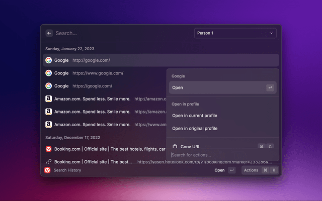 Open profile support is limited to opening tab in new profile window. You can customize default tab opening behaviour in settings.