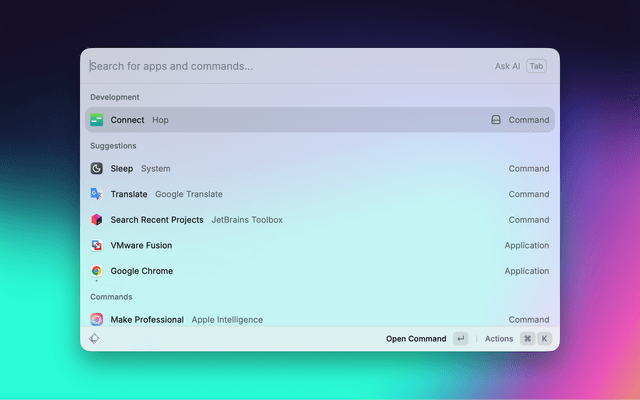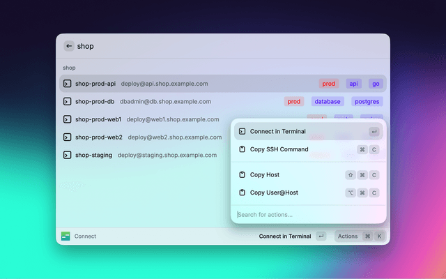 Fast SSH connection manager for Raycast. Fuzzy search and connect to servers from your hop config.