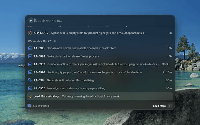- List Worklogs: View recent work logs grouped by day with total hours