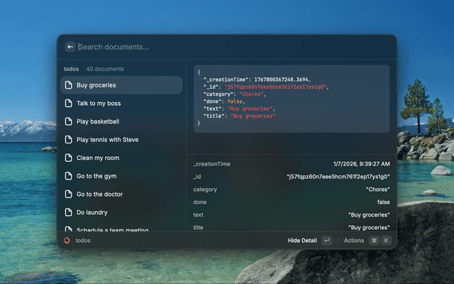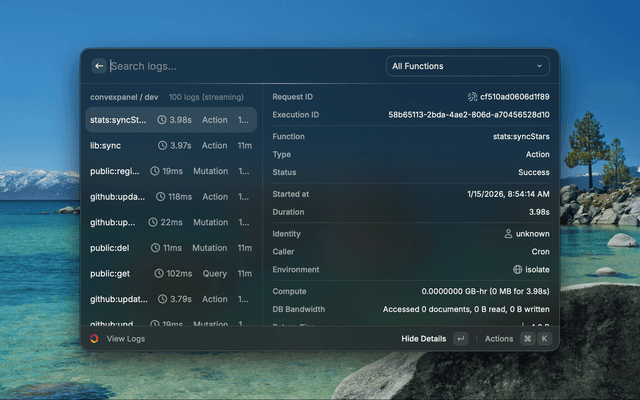 Interact with your Convex projects directly from Raycast. Switch between projects, run functions, browse tables, view real-time logs, search documentation, and explore components without leaving your keyboard.