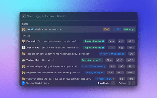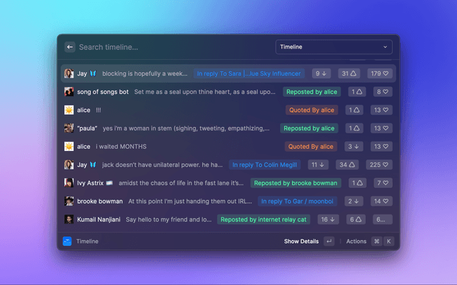 Browse through your Bluesky timeline. Create new posts, find people, and view your notifications. All from Raycast.