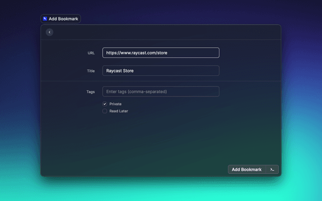 Post new bookmarks to Pinboard and search through your Pinboard bookmarks. Tip: Assign a global shortcut to the "Add Bookmark" command, select a URL, and then run the command ✨