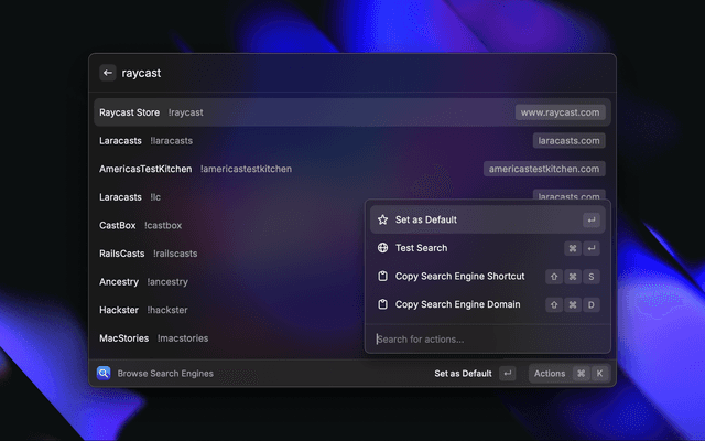 Pro Tip: ✨ For the best experience, set up Search Router as a Fallback Command in Raycast. This allows you to use bangs directly from the main Raycast search without having to first open the extension!