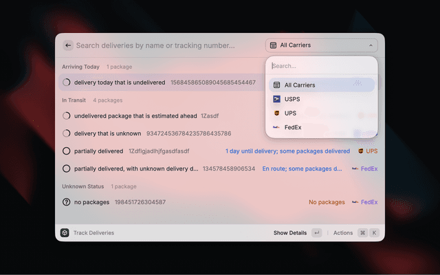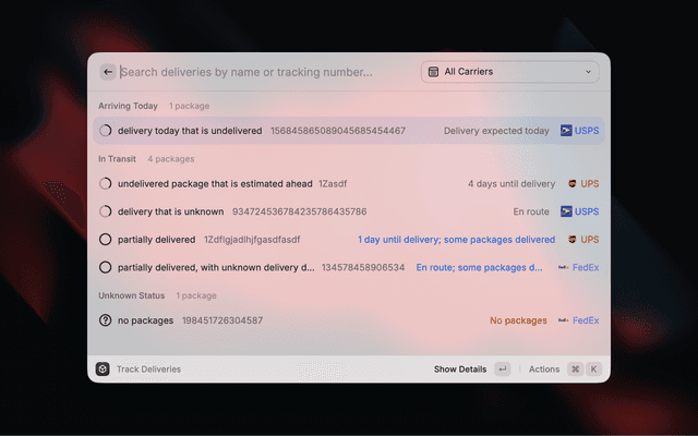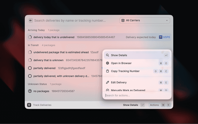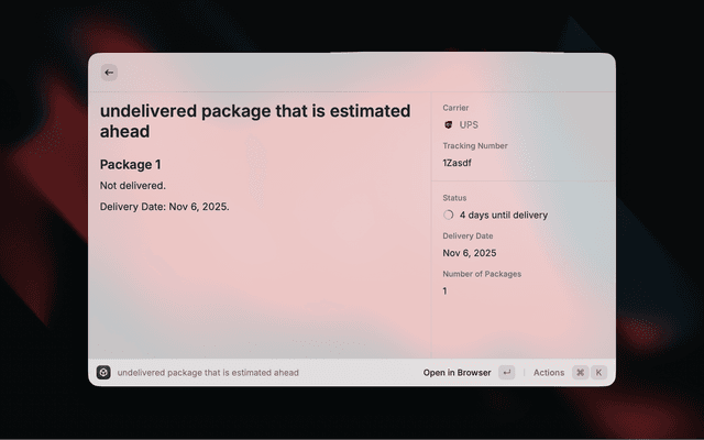 Tracks deliveries, packages, and parcels in Raycast. Remembers your deliveries, so you can keep watch as they make their way to you.