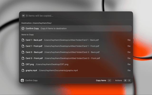 A Raycast extension that lets you collect files and folders from anywhere on your Mac into a virtual "shelf," then run batch actions: copy all to a folder, move all, or rename with prefix, suffix, numbering, or find/replace. Handles conflicts and works across volumes.