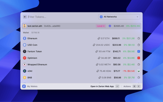 Monitor any account directly in the Raycast! Easy access your favorites, view all NFTs in a collection, and stay updated with real-time market insights with quick links to the Zerion web app!