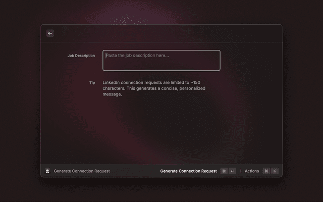 Paste a job description to generate a LinkedIn connection request message.