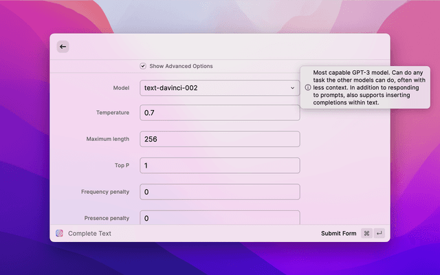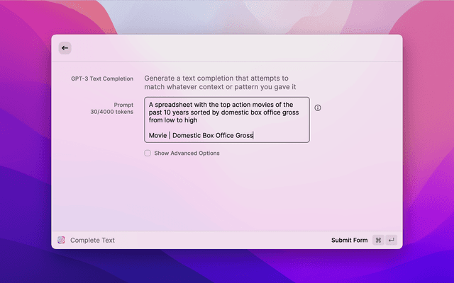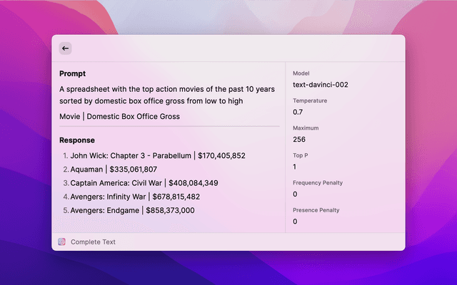 1. Complete Text - uses the GPT-3 AI models to generate a text completion that attempts to match whatever context or pattern you gave it