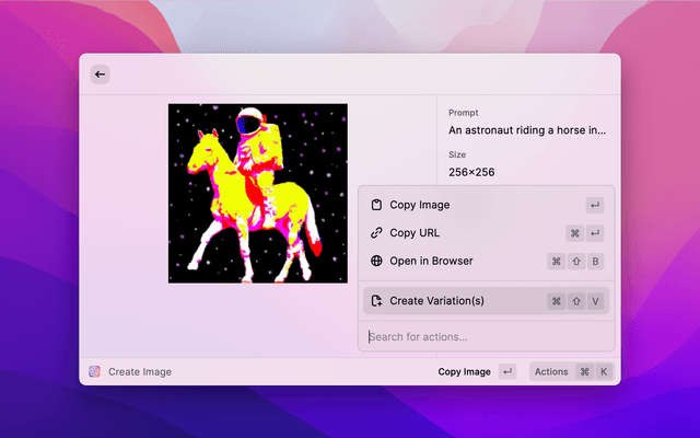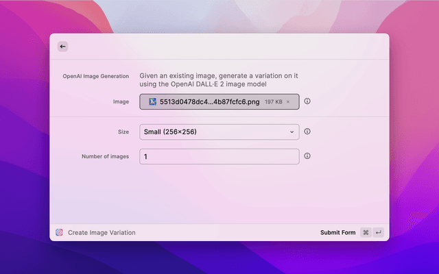 3. Create Image Variation - uses the DALL•E AI model to create a variation on an image you upload from your local disk