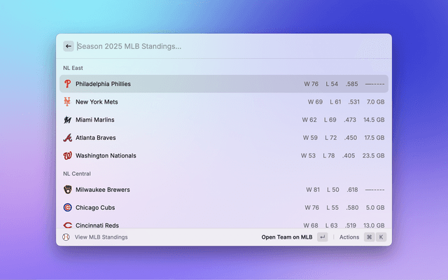 Browse up-to-date MLB standings grouped by league and division. See wins, losses, win percentage, and games back. You can choose which league (AL or NL) appears first via a command argument or preference.