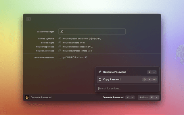• Password Generation: Generate secure passwords with custom options or instantly with defaults, automatically copied to clipboard
