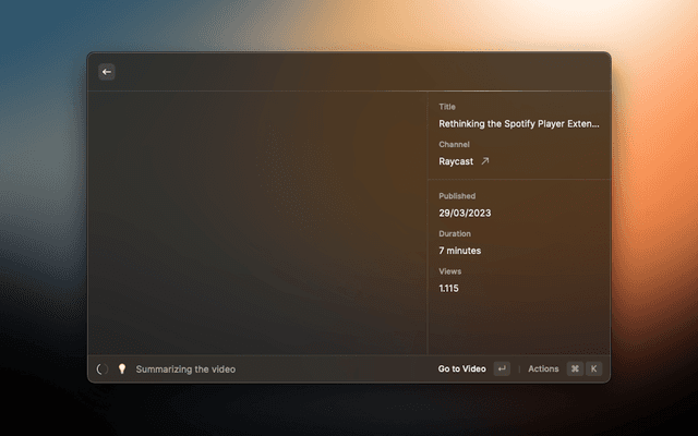 Summarize any YouTube Video with AI and ask follow up questions to get all the details. Choose between Raycast, OpenAI ChatGPT or Anthropic Claude. You have to either be a Raycast Pro Member, have access to an OpenAI API Key or Anthropic API Key to use this extension. Alternatively, you can use the extension with Ollama to summarize YouTube videos using a local LLM.
