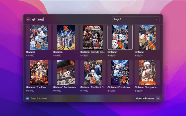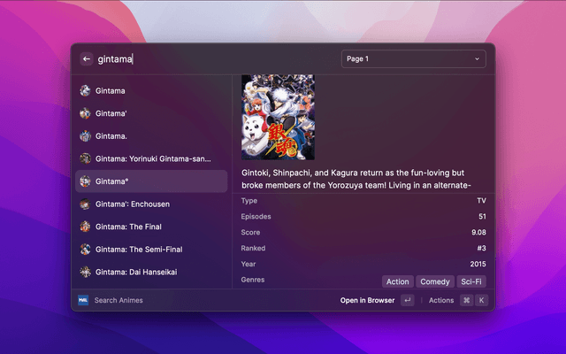 In the list view, you can toggle between simple and detailed views with the action "Cmd+Enter". Navigate through the results with the pagination! When search bar is empty, it will show you the seasonal animes. NSFW animes are hidden by default but you can toggle their visibility in the settings.
