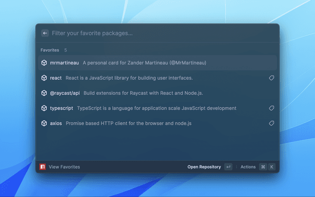 Find this extension on the Raycast store raycast-extensions is released under the MIT license. PRs welcome! Follow @MrMartineau Open in GitHub.dev