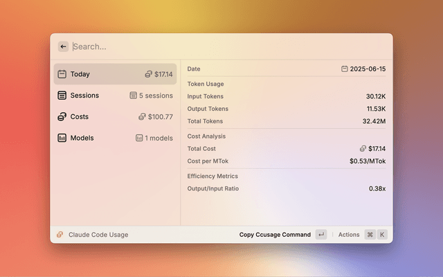 A Raycast extension that provides real-time monitoring of Claude Code usage statistics using the ccusage CLI tool.