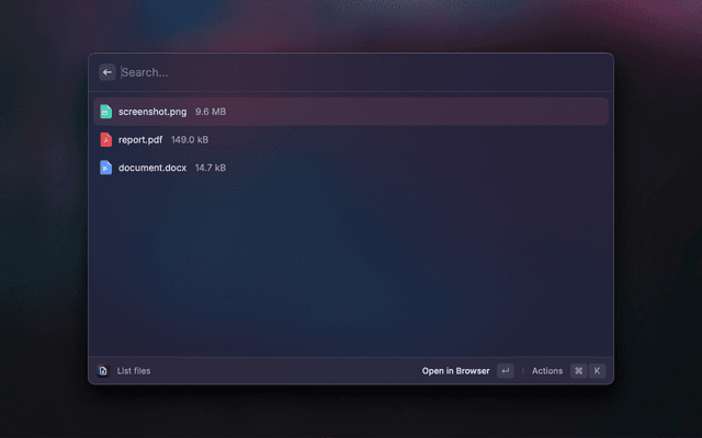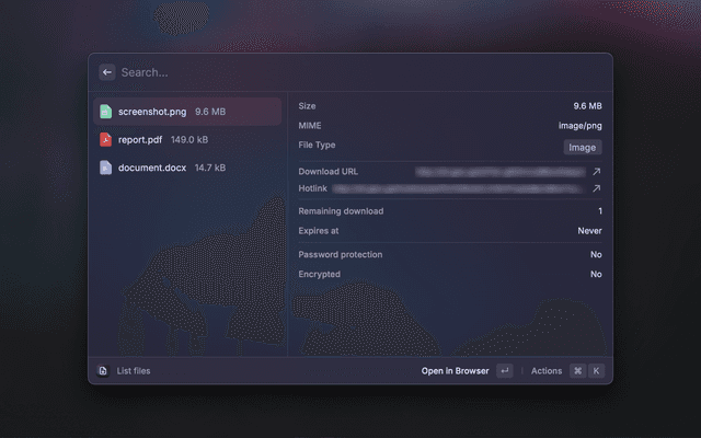 This Raycast extension allows you to manage your Gokapi server directly from Raycast. Use it to upload files, list existing files, copy download and hotlink URLs, and delete files with ease.