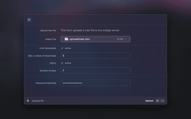 Set your Gokapi server URL and API key in the extension preferences. You can generate an API key in your Gokapi server's admin panel.