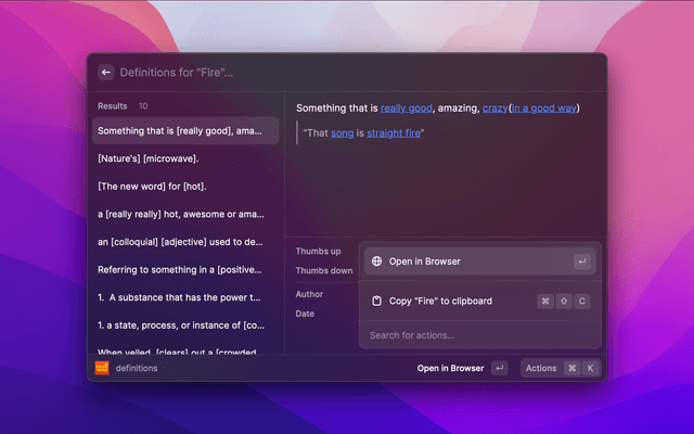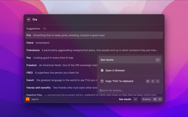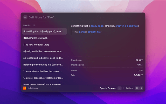 Warning: This extension might not be compliant with the Terms of Service of Urban Dictionary. However it does try to be respectful by using throttle and cache, and including author names and links to the website. Use at your own risk.