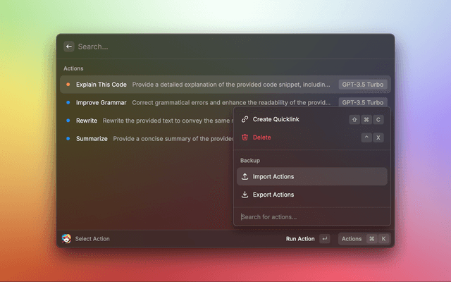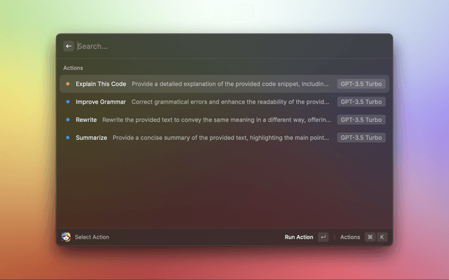 Alice AI is a daily productivity tool that uses your selection to execute actions using OpenAI's GPT models. It allows you to easily browse your actions, execute them, and go back to your result history. You can also add your own actions, create quicklinks to them, and back them up.