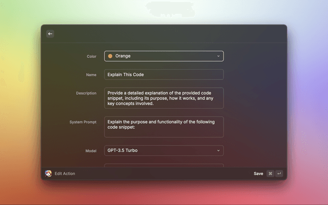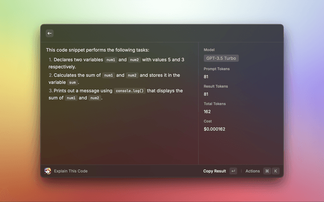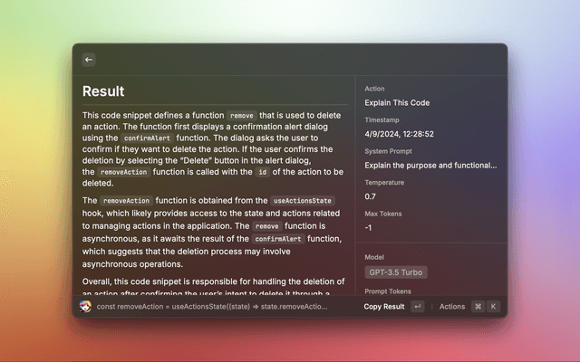 Alice helps with your daily tasks by providing quick access to OpenAI's ChatGPT API. Use Alice to generate text, code, and more with just a few keystrokes.