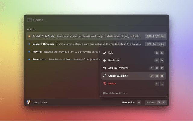 Alice AI allows you to quickly access your actions from the raycast root. Just create a quicklink to your actions.