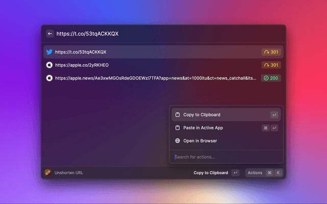 • Quick Command: Run the extension through the command menu or by using a keyboard shortcut of your choice, the expanded url gets copied to your clipboard and pasted to your current app.