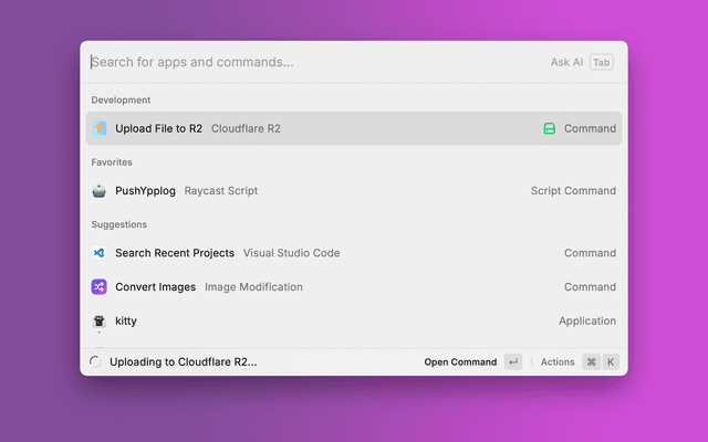 2. Open Raycast (Cmd + Space) and search for "Upload File to R2"