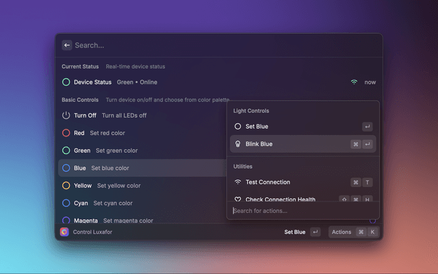 Control your Luxafor LED device directly from Raycast with real-time status monitoring and quick color controls. Perfect for developers, streamers, or anyone who wants quick access to their Luxafor device controls.
