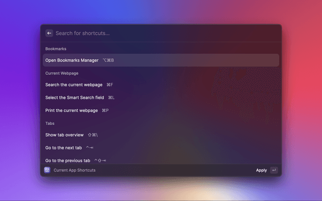 Show shortcuts for the frontmost web application. Command will exit if no web application is detected or if it is missing in the Hotkys database.