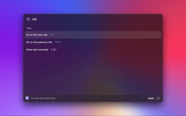 Show shortcuts for the frontmost desktop application. Command will exit if no desktop application is detected or if it is missing in the Hotkys database.