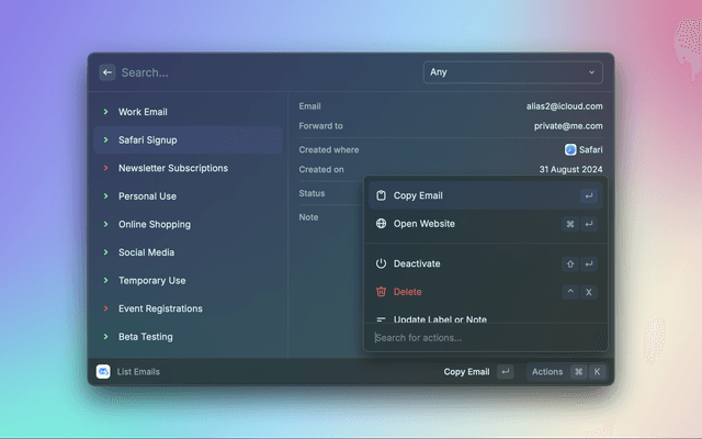 Provides an interface for managing all generated iCloud Hide My Email addresses.