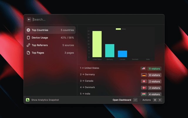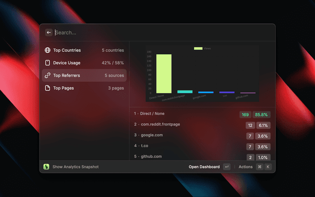Keep track of your website analytics right from your macOS menu bar. View comprehensive analytics including top countries, device usage, top pages, referrers, and more - all from the last 24 hours.