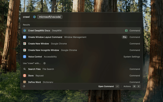 • Usage: Activate Raycast, type Crawl DeepWiki Docs, enter the repository identifier, and press Enter. Alternatively, use the Cmd+Shift+K shortcut on a result in the "Search DeepWiki Repos" command.