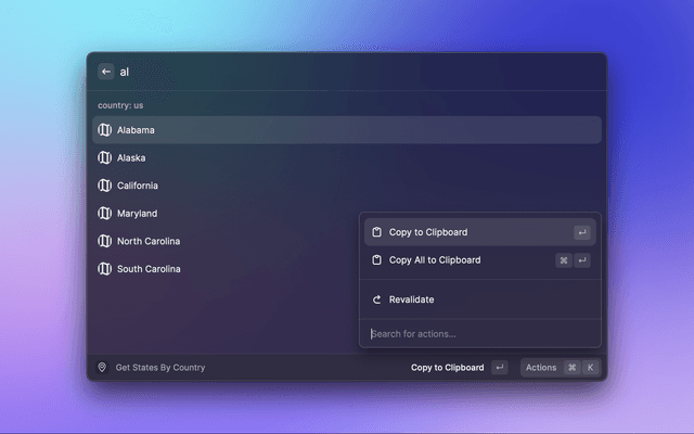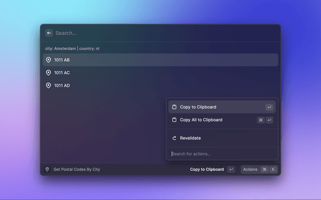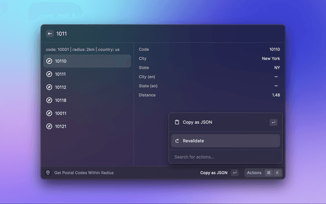This is a Raycast extension for Zipcodebase. With this extension you can lookup postal codes, calculate distances and much more using Zipcodebase API.